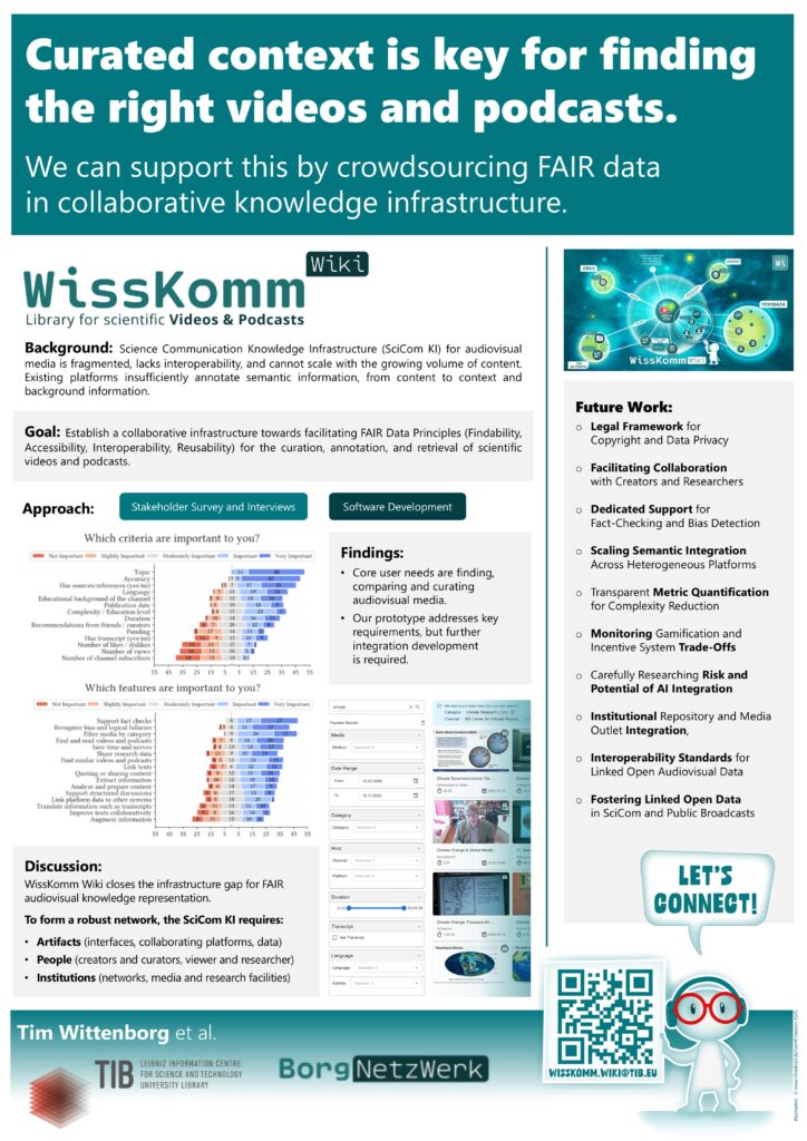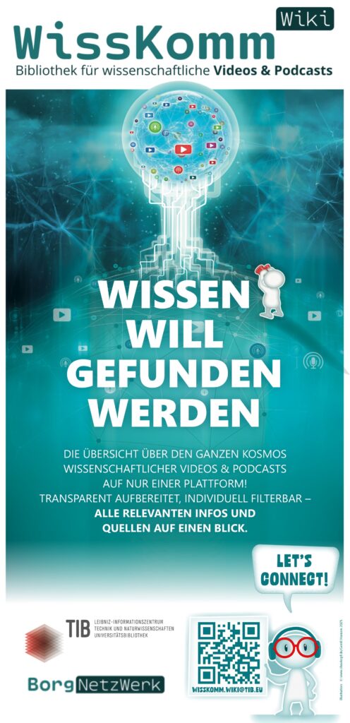 “Wir sehen das WissKomm‑Wiki als Teil unserer Mission, der Gesellschaft Informationen bereitzustellen. Es ergänzt die bestehenden Systeme, den Open Research Knowledge Graph für wissenschaftliche Artikel und das TIB AV-Portal für Videos, indem es Informationen zu wissenschaftlichen Videos und Podcasts aufbereitet und strukturiert verfügbar macht. Die TIB unterstützt dieses Ziel: Das WissKomm‑Wiki ist eine sinnvolle Ergänzung unserer technischen Infrastruktur, die wir langfristig fördern werden.”