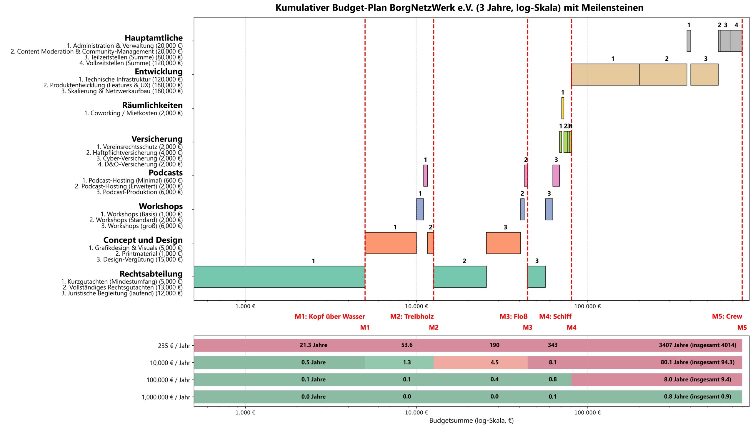 In diesem Abschnitt fassen wir die einzelnen Funding-Goals aus dem Budget zusammen und ordnen sie in eine Meilenstein-Logik. Ziel: klare Prioritäten, transparente Mittelverwendung und ein pragmatischer Fahrplan vom Prototyp zur Skalierung. Die Reihenfolge orientiert sich an der Dringlichkeit: Rechtliche Klarheit und minimale Sichtbarkeit zuerst, Infrastruktur und Teamaufbau später.